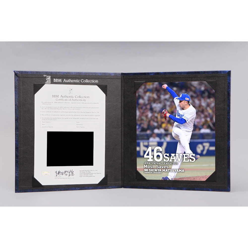 商品添付のサイン証明書(サイン風景写真入り)には「1/90」~「90/90」のシリアルナンバーが印字されます(番号はお選びいただけません)。また、松山晋也投手の背番号にちなみ、シリアルナンバー「90/90」の商品は、松山投手本人に贈呈されます。