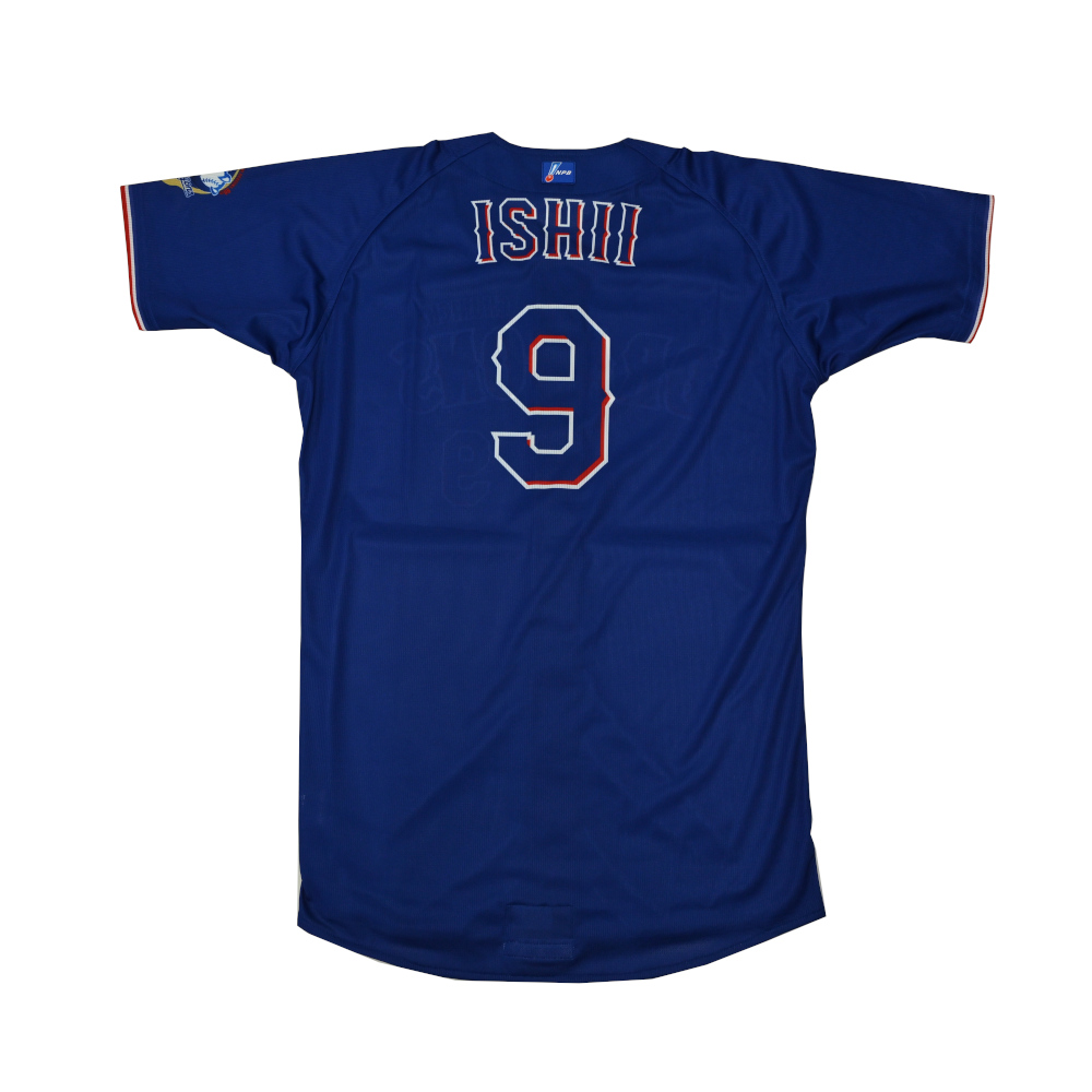 ビジター遠征時に選手が着用しているビジター用プロモデル。NPBワッペン付き。ミズノプロマーク入り。