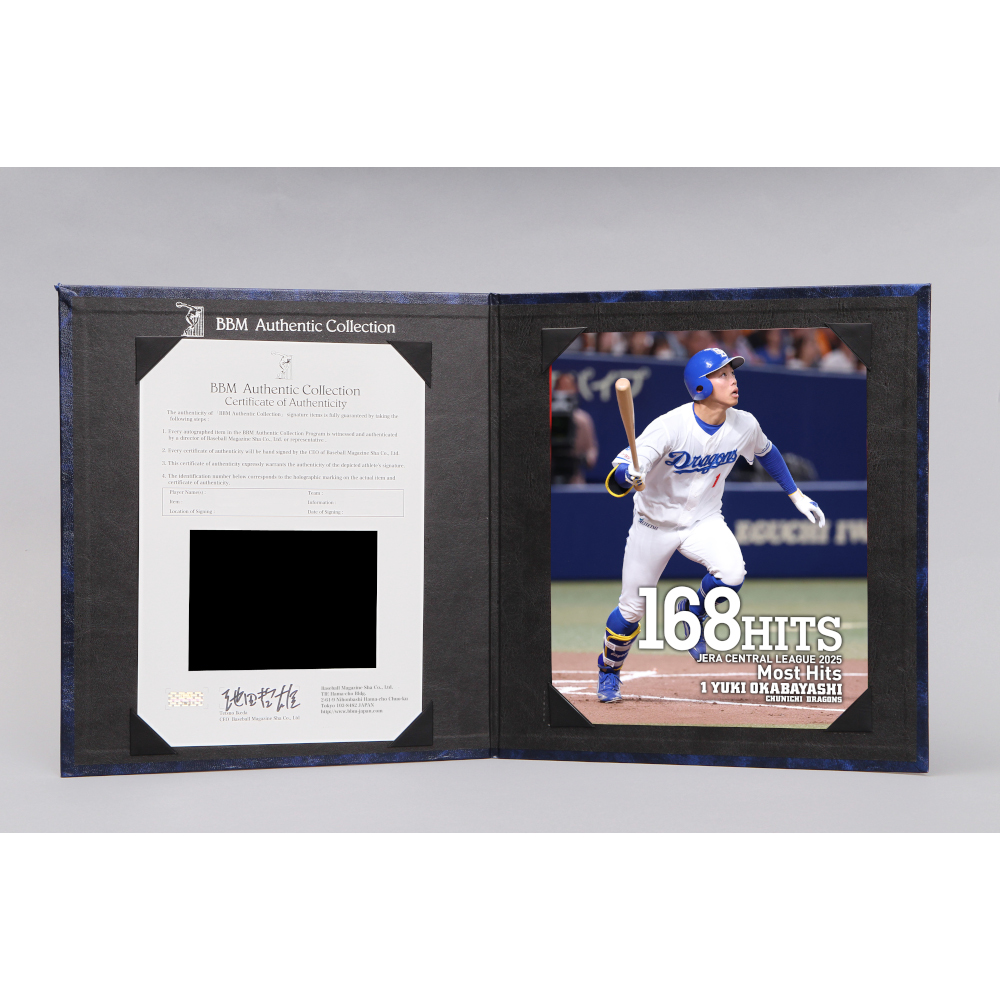 専用ケースのプレート部分および商品添付のサイン証明書(サイン風景写真入り)には「1/20」~「20/20」のシリアルナンバーが印字されます(番号はお選びいただけません)。また、岡林勇希選手の背番号にちなみ、シリアルナンバー「1/20」の商品は、岡林選手本人に贈呈されます。